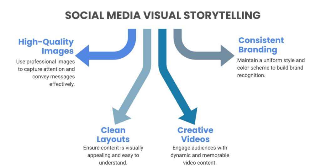 One of the best ways to market on social media today is through visual storytelling. Because people process visual information faster than text, the visual part of your content can affect how well your message gets across. Your content will stand out if you use high-quality images, clean layouts, professional graphics, creative videos, and well-designed carousels. Strong visuals grab people’s attention, show how you feel, point out important points, and make your brand more memorable.
